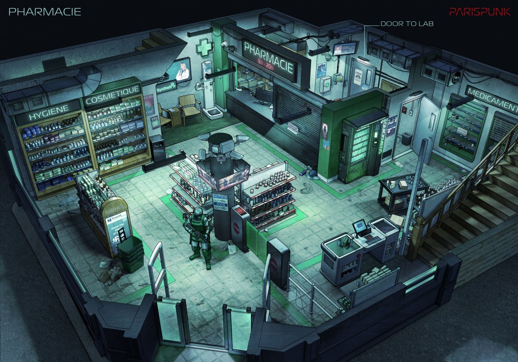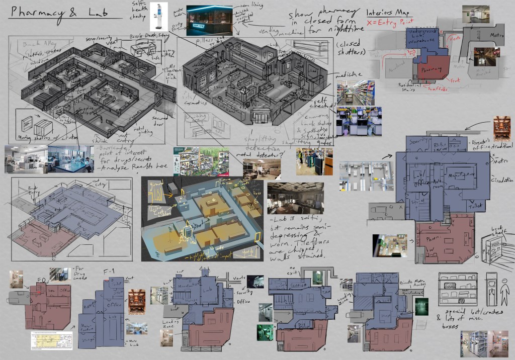The player can either do business in front, use the vending machine, or sneak into the laboratory. There are secret documents, drugs, and other valuable items. The facility has many entry-points for various gameplay styles.