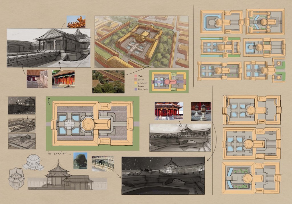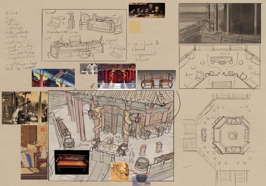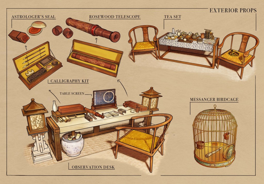 The patio outside the observatory allows the emperor’s astrologer to observe and record his findings and provides room for administrative and imperial guests.The table screen protects against wind, while the lacquered boxes make the setup mobile.